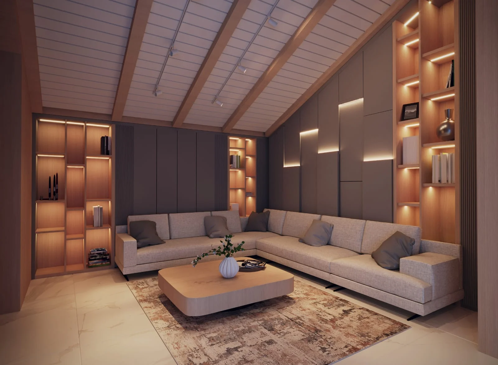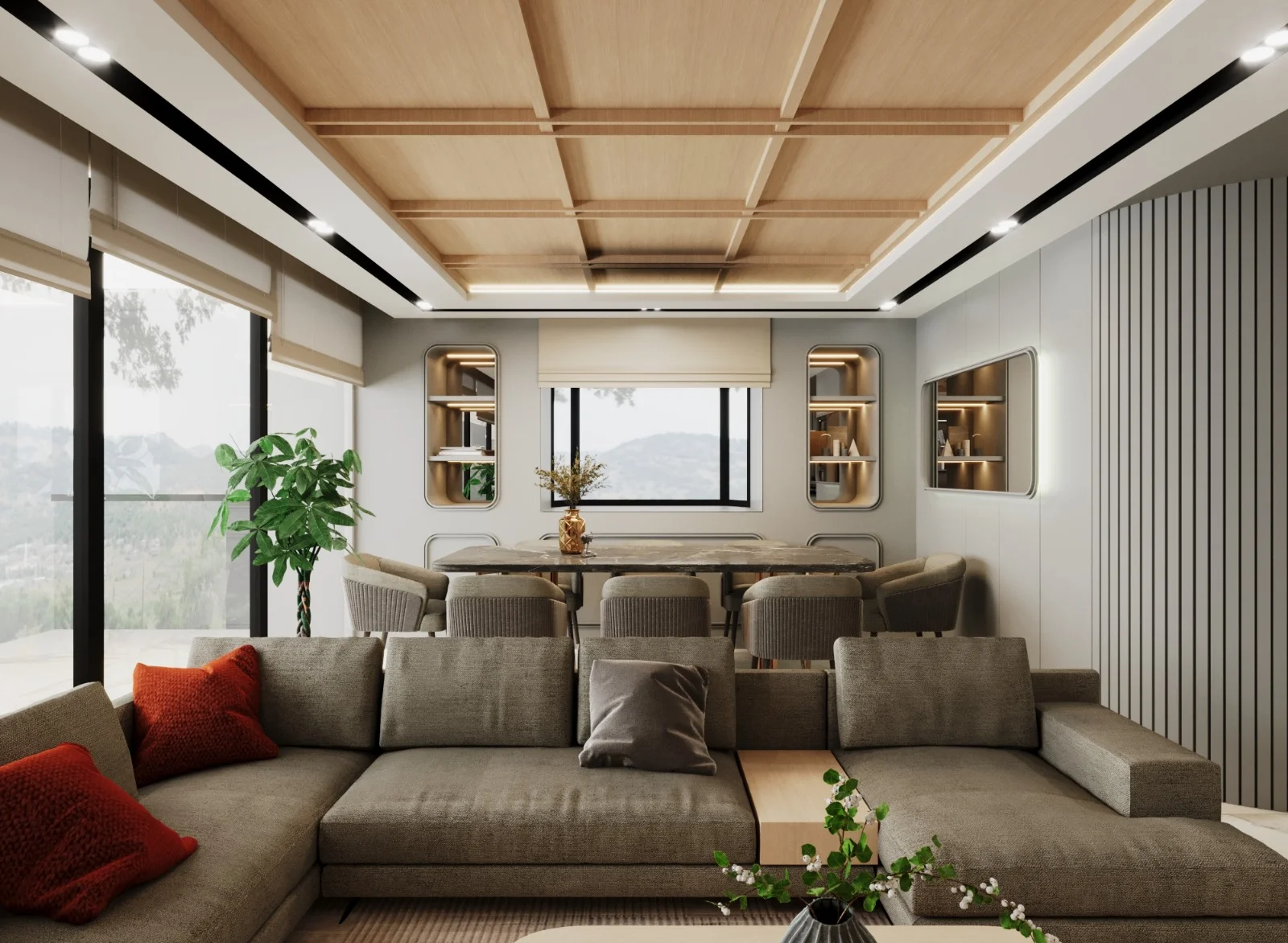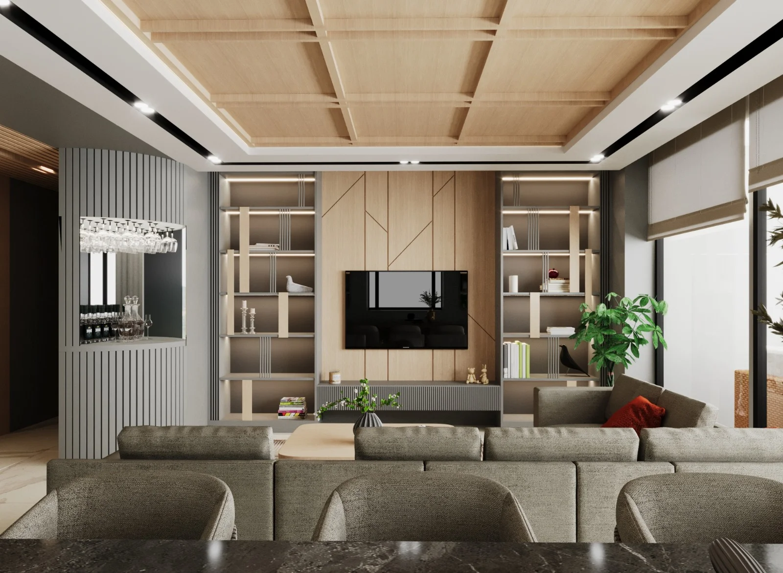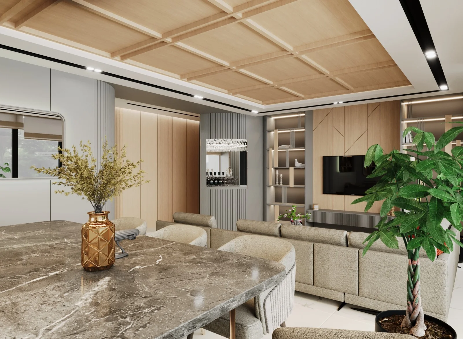 DNY Mimarlık, modern estetikle sıcak ve davetkâr bir atmosfer oluşturmayı amaçladığı büyük oda konut tasarımlarında, ahşabın doğal sıcaklığını duvarlarda kullanarak mekânlara benzersiz bir karakter kazandırıyor. Meşe ahşap kaplamalar, tasarımlarımızın temelini oluştururken odalara doğallık ve sıcaklık katıyor. Duvarlarda kullanılan meşe ahşap kaplamalar, mekânın içinde huzurlu bir atmosfer yaratırken aynı zamanda modern mimariye özgü dokunuşları da sunuyor. Ahşabın sıcak tonları, odanın her köşesine doğal bir zarafet katarken, modern seramik kaplamalarla bütünleşen zemin ise mekânın çağdaş karakterini vurguluyor. Zemindeki modern seramik kaplamalar, tasarımın dinamik yönünü ve modern estetiği vurguluyor. Temiz çizgiler, zarif desenler veya minimalist dokunuşlarla zemindeki seramik kaplamalar, mekânın ferah ve modern bir hissiyatını destekliyor. Işıklandırmaya da büyük önem veriyoruz. Doğal ışıkla birlikte kullanılan aydınlatmalar, ahşap ve seramik detaylarıyla harmanlanmış bu büyük odaların sıcaklığını ve modern çizgilerini vurguluyor. Bizim tasarımlarımızda, ahşap ve seramik gibi farklı malzemelerin uyum içinde kullanılması, odaların çağdaş, davetkâr ve sıcak bir atmosfere sahip olmasını sağlıyor. Bu kombinasyon, mekanlara benzersiz bir kimlik kazandırırken modern yaşamın gereksinimlerini de karşılıyor.