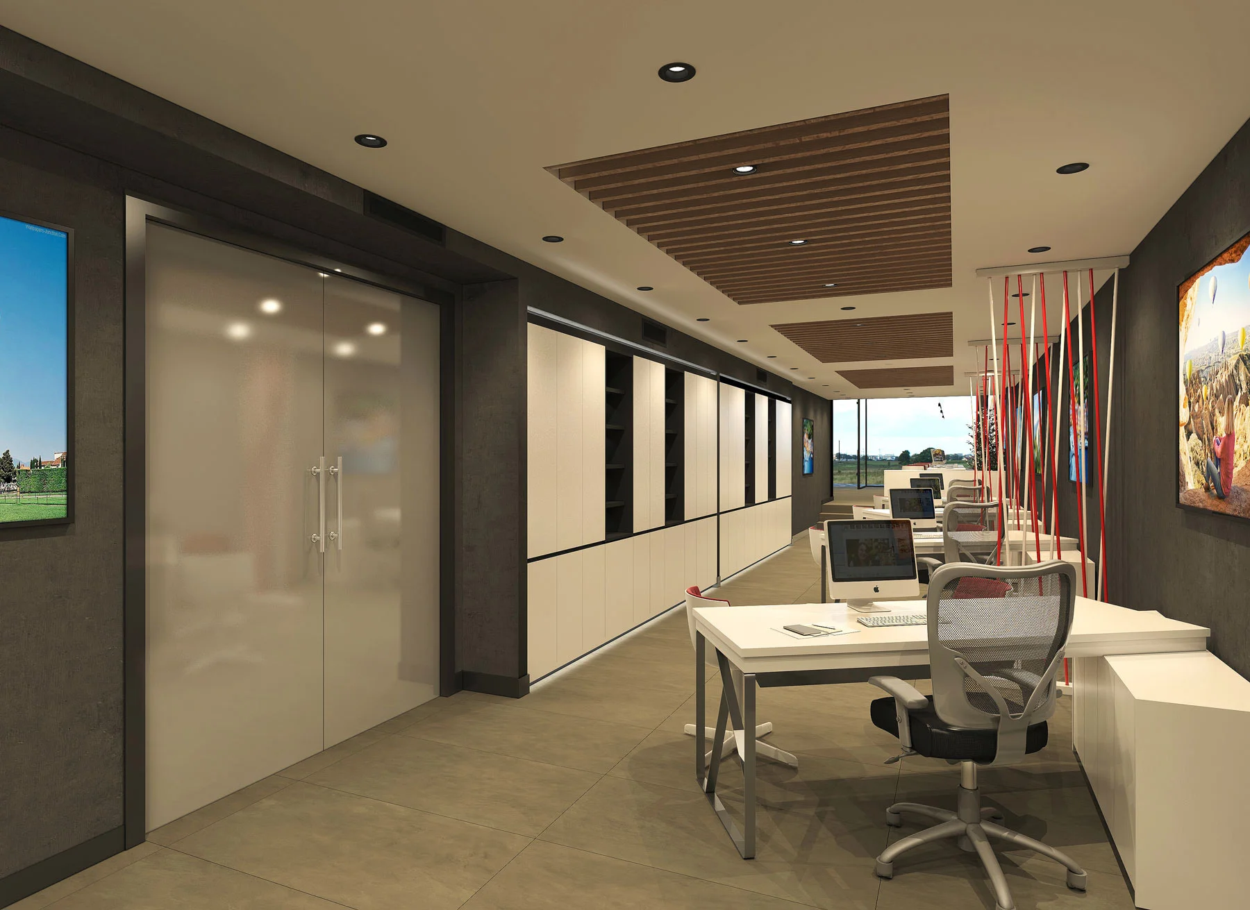 Ofis içerisinde kullanılan separetörler, sadece alanı bölmek için değil; çalışanlar arasında daha canlı bir iletişim oluşsun diye tercih edilmiş. Öyle keskin ayrımlar yaratmayan, ama yine de odaklanmaya yardımcı olan çözümler bunlar. Modern ofis tasarımında sıkça görülse de burada kullanım şekli biraz daha samimiyet katıyor mekâna.