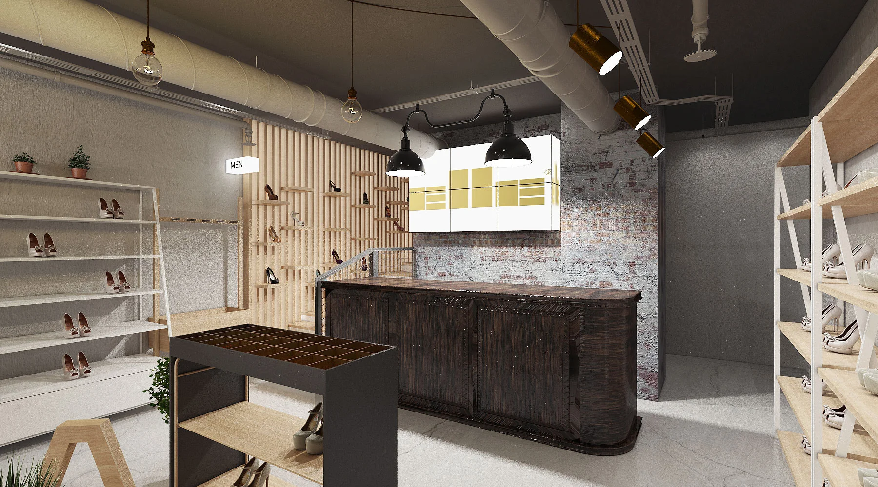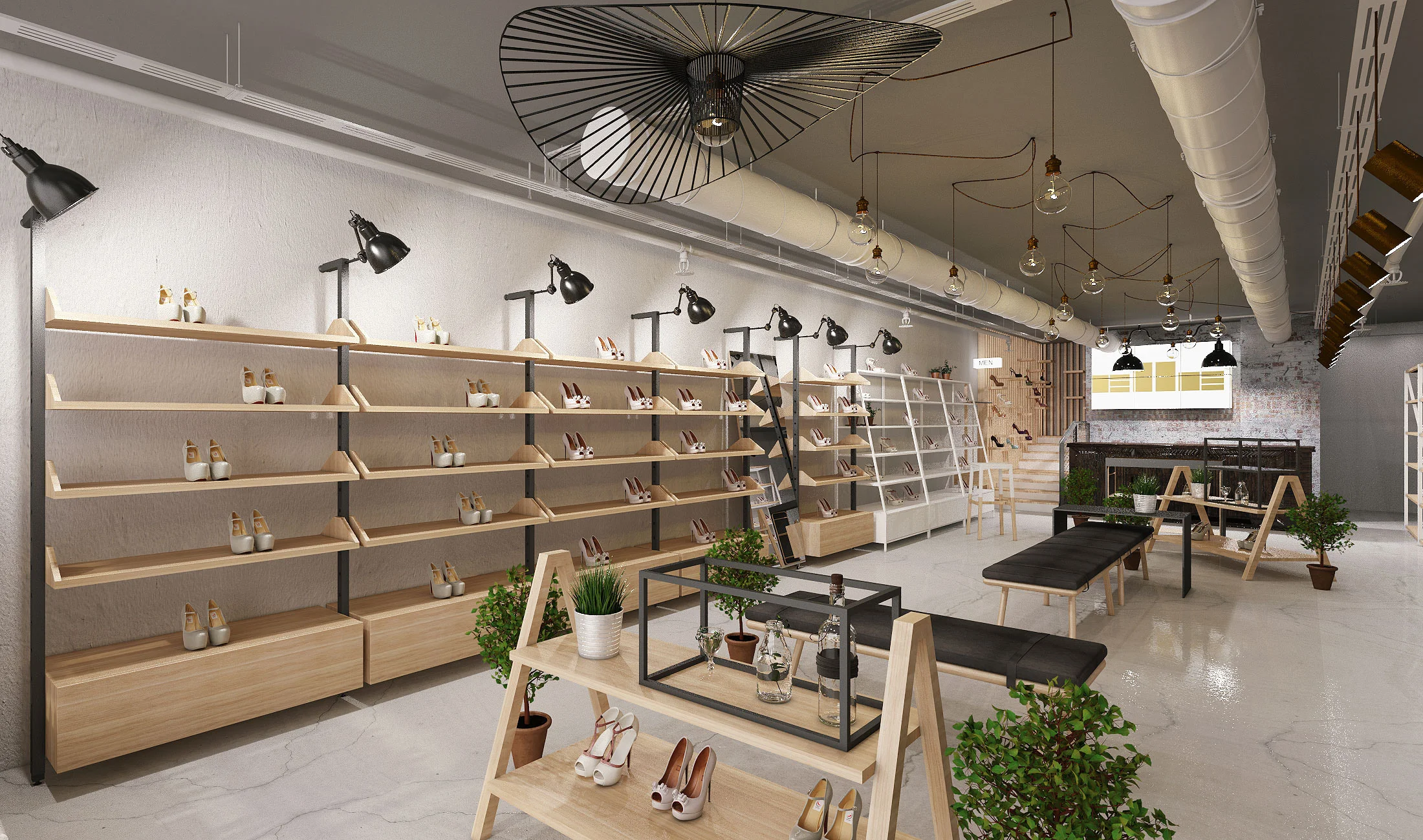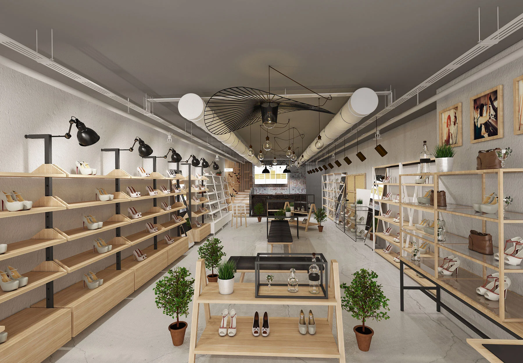 Elle mağazası, modern tasarım ve doğal malzemelerin birleşimiyle dikkat çekmektedir. Ayakkabıların etkileyici bir şekilde sergilenmesi için her detay titizlikle düşünülmüştür.