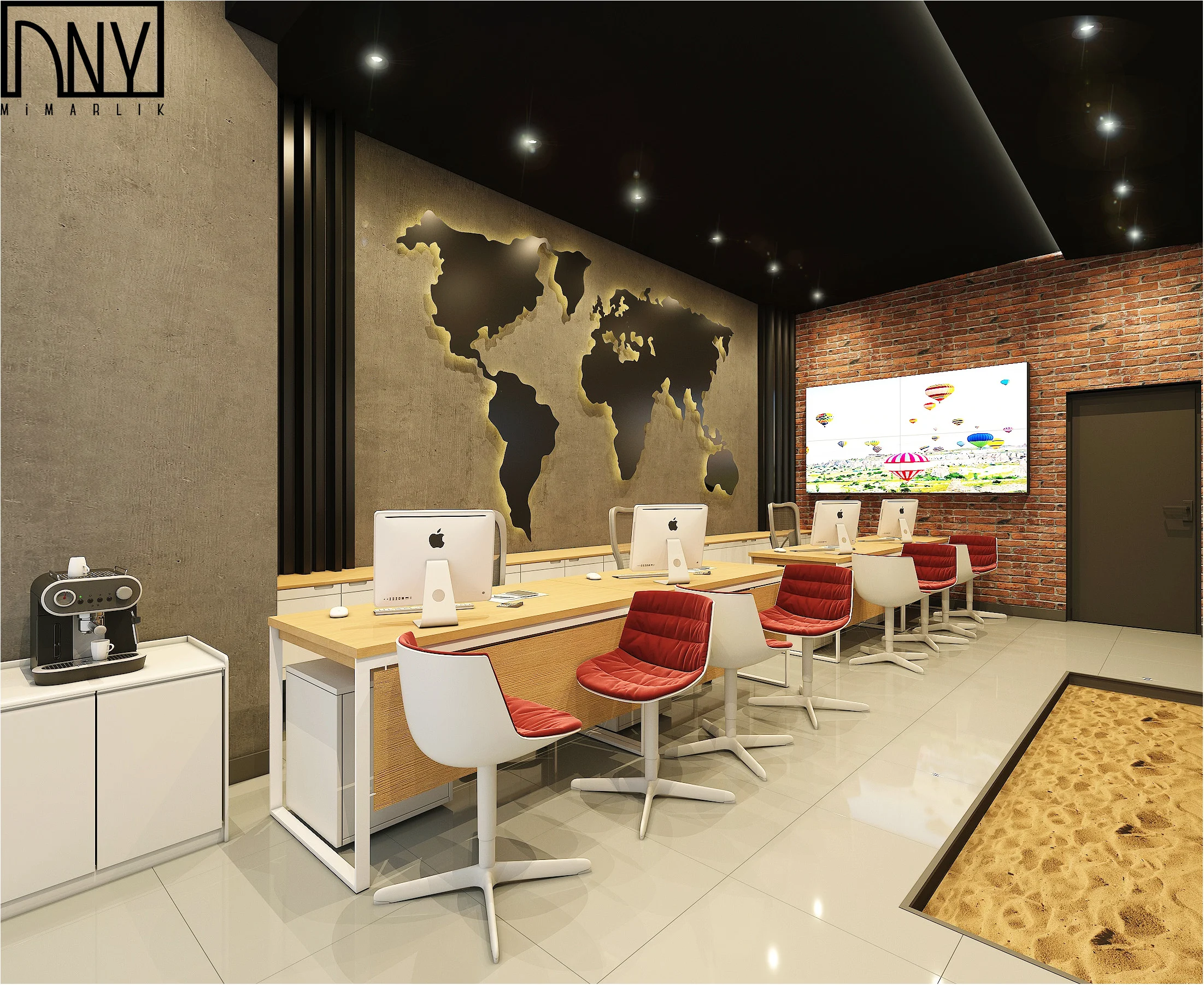 Girişten itibaren uzun çalışma bankosu, modern çizgileriyle hem çalışanların hem de ziyaretçilerin rahat hareket etmesini sağlıyor. Bu alanın ofis uygulaması sırasında, mekânın akışını bozmadan fonksiyonel bir yapı elde etmek için özellikle sade tutulduğu belli oluyor. Kırmızı koltuklar ise markanın enerjik tonunu mekâna taşırken aynı zamanda sıcak bir karşılama hissi veriyor. Duvar boyunca uzanan büyük dünya haritası, iç mekânın odak noktalarından biri haline geliyor. Arkadan aydınlatmalı bu harita, modern mimari ofis tasarımı içinde hem dekoratif hem de temaya uygun bir eleman olarak öne çıkıyor. “Dünyayı keşfetme” fikrini duvardan mekânın içine doğru taşıyor sanki. Tuğla duvar yüzeyi de bu sıcaklığı destekleyerek ortama daha samimi bir derinlik kazandırmış.