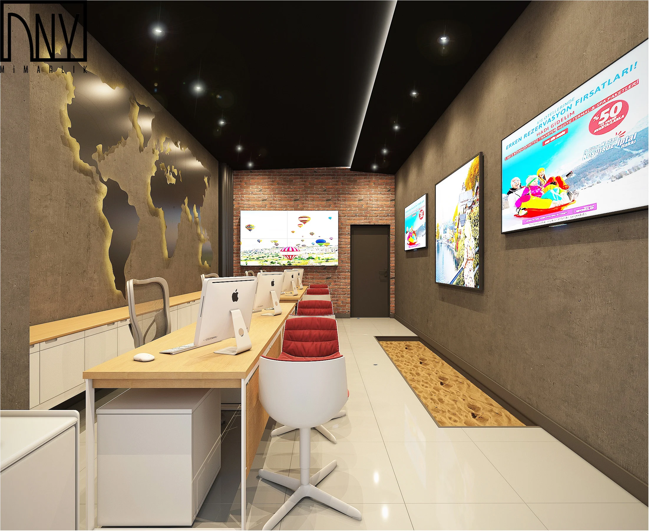 Zemin üzerinde yer alan kum efekti ise mekânın en sürprizli detayı. Adeta AVM’nin içinde küçük bir sahil izi bırakılmış gibi. Müşteri içeri girer girmez ayaklarının altında kum sesi duyacakmış hissi veriyor; böyle olunca da tatil fikri daha ilk saniyede zihne düşüyor. Aydınlatmalar da modern ofis tasarımlarında sıkça gördüğümüz minimal çizgiyi takip ediyor. Tavan boyunca uzanan lineer ışıklar, mekânın derinliğini artırırken spotlar da vurgulanmak istenen bölgelere yönlendirilmiş. Ekranlarda dönen tatil görüntüleriyle birleşince mekân canlı, hareketli ve sürekli yenilenen bir atmosfere dönüşüyor. Sonuç olarak, Emaar AVM Jolly Tur şubesinin iç mimari tasarımı; modern mimari ofis tasarımı anlayışını, tema odaklı bir atmosferle buluşturan başarılı bir ofis uygulaması örneği olarak öne çıkıyor. Sade ama sıcak, modern ama samimi bir karakteri var. Yani bir acente değil, daha çok bir yolculuğun başlangıç noktası gibi duruyor.