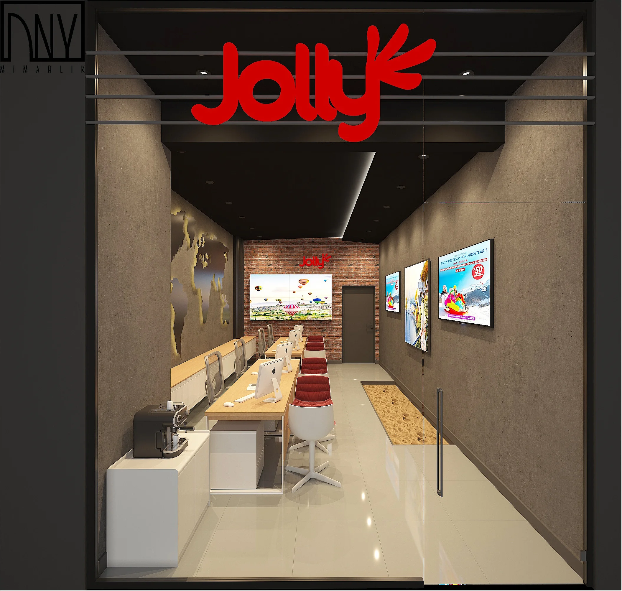 Emaar AVM’de yer alan Jolly Tur acentesinin iç mimari tasarımı, modern mimari ofis tasarımı yaklaşımıyla hazırlanmış olsa da, mekânın içinde gezerken insan kendini daha çok bir tatil hikâyesinin başlangıcında buluyor. Yani klasik bir ofis gibi değil, daha çok “ben buradan çıkınca bir yere gitmeliyim” hissi geliyor insana. Belki de tasarımın en başından beri hedeflediği şey buydu.