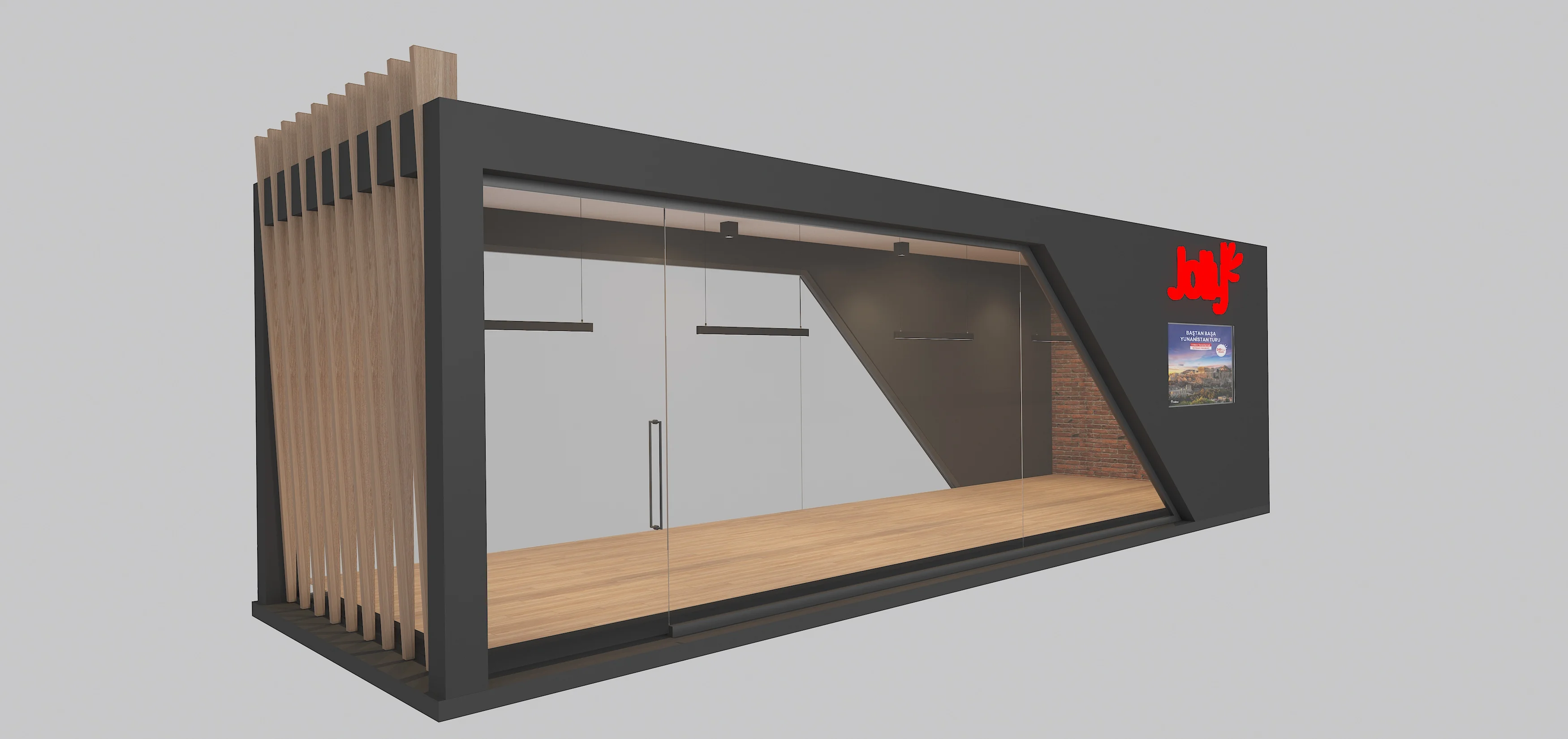 Bu kiosk tasarımı, yalnızca estetik açıdan değil, aynı zamanda kullanıcı deneyimi açısından da oldukça başarılı. Açık ve erişilebilir giriş noktası, iyi planlanmış iç mekân akışı ve şık aydınlatmalar, ziyaretçilerin Jolly Tur’un hizmetlerine kolayca ulaşmasını sağlıyor.